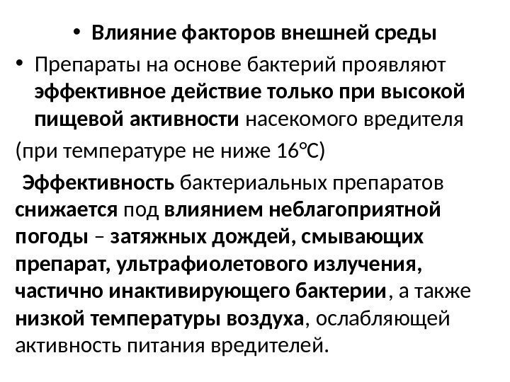 • Влияние факторов внешней среды • Препараты на основе бактерий проявляют эффективное действие только при высокой пищевой активности насекомого вредителя (при температуре не ниже 16°С) Эффективность бактериальных препаратов снижается под влиянием неблагоприятной погоды – затяжных дождей, смывающих препарат, ультрафиолетового излучения, частично инактивирующего бактерии , а также низкой температуры воздуха , ослабляющей активность питания вредителей.