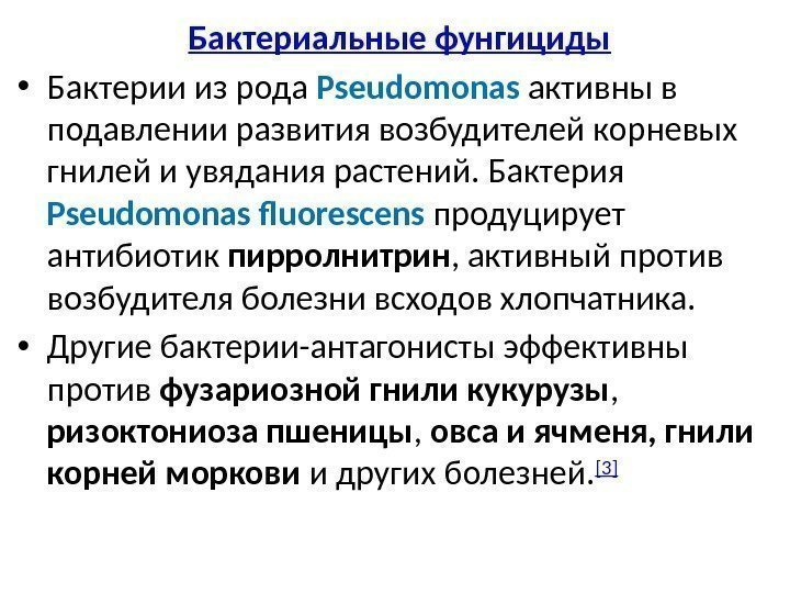 Бактериальные фунгициды • Бактерии из рода Pseudomonas активны в подавлении развития возбудителей корневых гнилей и увядания растений. Бактерия Pseudomonas fluorescens продуцирует антибиотик пирролнитрин , активный против возбудителя болезни всходов хлопчатника. • Другие бактерии-антагонисты эффективны против фузариозной гнили кукурузы , ризоктониоза пшеницы , овса и ячменя, гнили корней моркови и других болезней. [3]