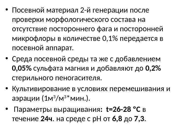 • Посевной материал 2 -й генерации после проверки морфологического состава на отсутствие постороннего фага и посторонней микрофлоры в количестве 0, 1% передается в посевной аппарат. • Среда посевной среды та же с добавлением 0, 05% сульфата магния и добавляют до 0, 2% стерильного пеногасителя. • Культивирование в условиях перемешивания и аэрации (1 м 3 /м 3 *мин. ). • Параметры выращивания : t=26 -28 ºС в течение 24 ч. на среде с р. Н от 6, 8 до 7, 3.