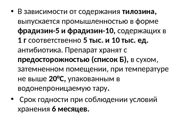 • В зависимости от содержания тилозина, выпускается промышленностью в форме фрадизин-5 и фрадизин-10, содержащих в 1 г соответственно 5 тыс. и 10 тыс. ед. антибиотика. Препарат хранят с предосторожностью (список Б), в сухом, затемненном помещении, при температуре не выше 20°С, упакованным в водонепроницаемую тару. • Срок годности при соблюдении условий хранения 6 месяцев.