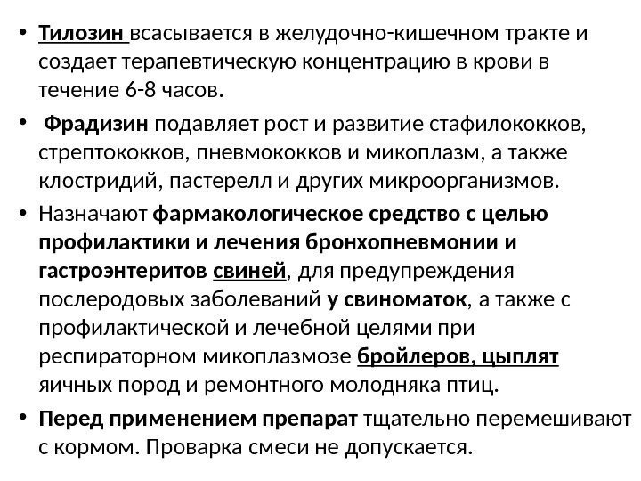 • Тилозин всасывается в желудочно-кишечном тракте и создает терапевтическую концентрацию в крови в течение 6 -8 часов. • Фрадизин подавляет рост и развитие стафилококков, стрептококков, пневмококков и микоплазм, а также клостридий, пастерелл и других микроорганизмов. • Назначают фармакологическое средство с целью профилактики и лечения бронхопневмонии и гастроэнтеритов свиней , для предупреждения послеродовых заболеваний у свиноматок , а также с профилактической и лечебной целями при респираторном микоплазмозе бройлеров, цыплят яичных пород и ремонтного молодняка птиц. • Перед применением препарат тщательно перемешивают с кормом. Проварка смеси не допускается.