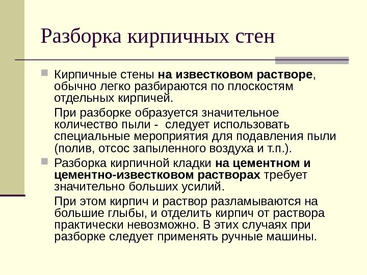 Разборка кирпичных стен Кирпичные стены на известковом растворе , обычно легко разбираются по плоскостям отдельных кирпичей. При разборке образуется значительное количество пыли — следует использовать специальные мероприятия для подавления пыли (полив, отсос запыленного воздуха и т. п. ). Разборка кирпичной кладки на цементном и цементно-известковом растворах требует значительно больших усилий. При этом кирпич и раствор разламываются на большие глыбы, и отделить кирпич от раствора практически невозможно. В этих случаях при разборке следует применять ручные машины.