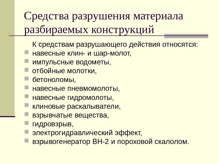 Средства разрушения материала разбираемых конструкций К средствам разрушающего действия относятся: навесные клин- и шар-молот, импульсные водометы, отбойные молотки, бетоноломы, навесные пневмомолоты, навесные гидромолоты, клиновые раскалыватели, взрывчатые вещества, гидровзрыв, электрогидравлический эффект, взрывогенератор ВН-2 и пороховой скалолом.
