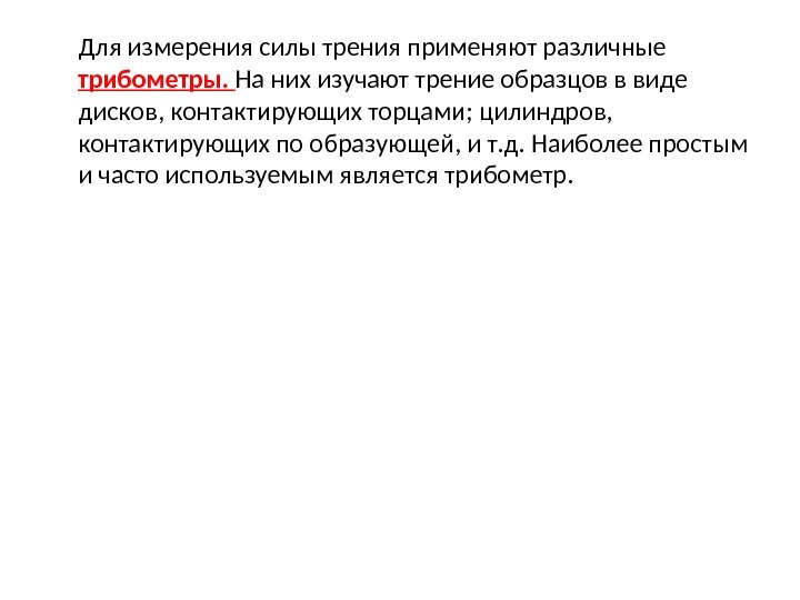 Для измерения силы трения применяют различные трибометры. На них изучают трение образцов в виде дисков, контактирующих торцами; цилиндров, контактирующих по образующей, и т. д. Наиболее простым и часто используемым является трибометр.