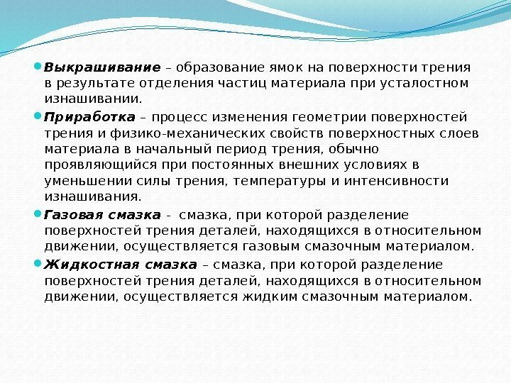 Выкрашивание – образование ямок на поверхности трения в результате отделения частиц материала при усталостном изнашивании. Приработка – процесс изменения геометрии поверхностей трения и физико-механических свойств поверхностных слоев материала в начальный период трения, обычно проявляющийся при постоянных внешних условиях в уменьшении силы трения, температуры и интенсивности изнашивания. Газовая смазка — смазка, при которой разделение поверхностей трения деталей, находящихся в относительном движении, осуществляется газовым смазочным материалом. Жидкостная смазка – смазка, при которой разделение поверхностей трения деталей, находящихся в относительном движении, осуществляется жидким смазочным материалом.