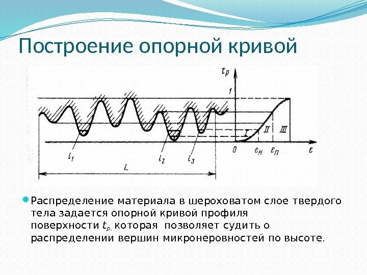 Построение опорной кривой Распределение материала в шероховатом слое твердого тела задается опорной кривой профиля поверхности t p, которая позволяет судить о распределении вершин микронеровностей по высоте.