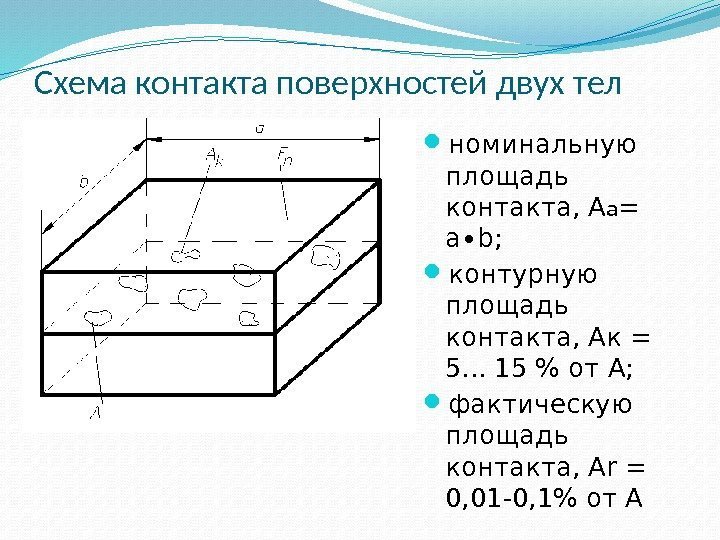 Схема контакта поверхностей двух тел номинальную площадь контакта, А а = a∙b; контурную площадь контакта, Ак = 5. . . 15 % от А; фактическую площадь контакта, Аr = 0, 01 -0, 1% от А