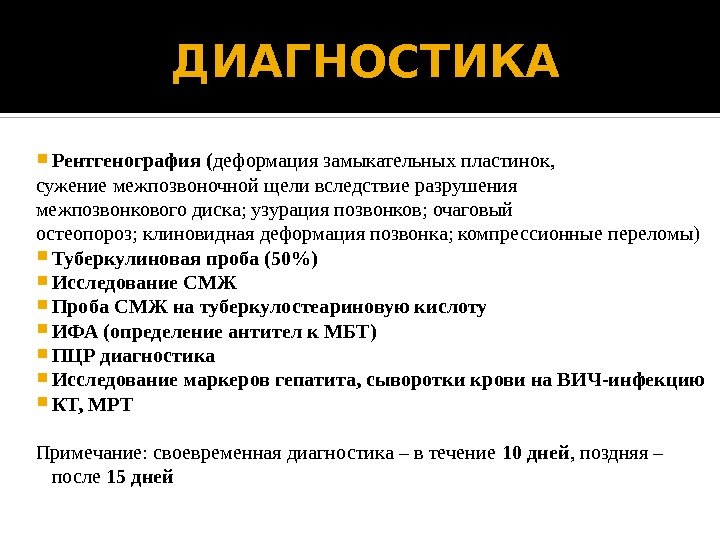 ДИАГНОСТИКА Рентгенография ( деформация замыкательных пластинок, сужение межпозвоночной щели вследствие разрушения межпозвонкового диска; узурация позвонков; очаговый остеопороз; клиновидная деформация позвонка; компрессионные переломы) Туберкулиновая проба (50%) Исследование СМЖ Проба СМЖ на туберкулостеариновую кислоту ИФА (определение антител к МБТ) ПЦР диагностика Исследование маркеров гепатита, сыворотки крови на ВИЧ-инфекцию КТ, МРТ Примечание: своевременная диагностика – в течение 10 дней , поздняя – после 15 дней
