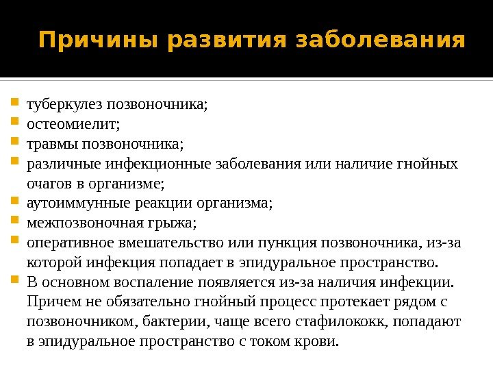 Причины развития заболевания туберкулез позвоночника; остеомиелит; травмы позвоночника; различные инфекционные заболевания или наличие гнойных очагов в организме; аутоиммунные реакции организма; межпозвоночная грыжа; оперативное вмешательство или пункция позвоночника, из-за которой инфекция попадает в эпидуральное пространство. В основном воспаление появляется из-за наличия инфекции. Причем не обязательно гнойный процесс протекает рядом с позвоночником, бактерии, чаще всего стафилококк, попадают в эпидуральное пространство с током крови.