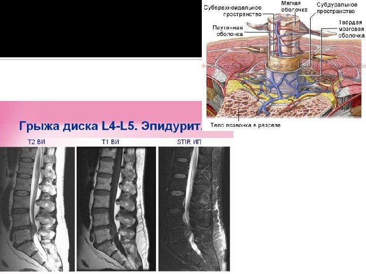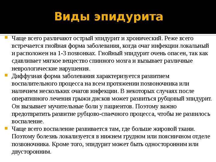 Виды эпидурита Чаще всего различают острый эпидурит и хронический. Реже всего встречается гнойная форма заболевания, когда очаг инфекции локальный и расположен на 1 -3 позвонках. Гнойный эпидурит очень опасен, так как сдавливает мягкое вещество спинного мозга и вызывает различные неврологические нарушения. Диффузная форма заболевания характеризуется развитием воспалительного процесса на всем протяжении позвоночника или наличием нескольких очагов инфекции. В некоторых случаях после оперативного лечения грыжи дисков может развиться рубцовый эпидурит. Он вызывает мучительные боли у пациентов. Поэтому важно предотвратить развитие рубцово-спаечного процесса, чтобы не развилось воспаление. Чаще всего воспаление развивается там, где больше жировой ткани. Поэтому болезнь локализуется в нижнем грудном или поясничном отделе позвоночника. Кроме того, эпидурит может быть односторонним или двусторонним.