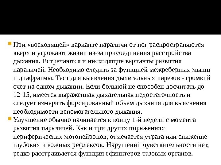 При «восходящей» варианте параличи от ног распространяются вверх и угрожают жизни из-за присоединения расстройства дыхания. Встречаются и нисходящие варианты развития параличей. Необходимо следить за функцией межреберных мышц и диафрагмы. Тест для выявления дыхательных парезов — громкий счет на одном дыхании. Если больной не способен досчитать до 12 -15, имеется выраженная дыхательная недостаточность и следует измерить форсированный объем дыхания для выяснения необходимости вспомогательного дыхания. Улучшение обычно начинается к концу 1 -й недели с момента развития параличей. Как и при других поражениях периферических мотонейронов, отмечается утрата или снижение глубоких и кожных рефлексов. Нарушений чувствительности нет, редко расстраивается функция сфинктеров тазовых органов.
