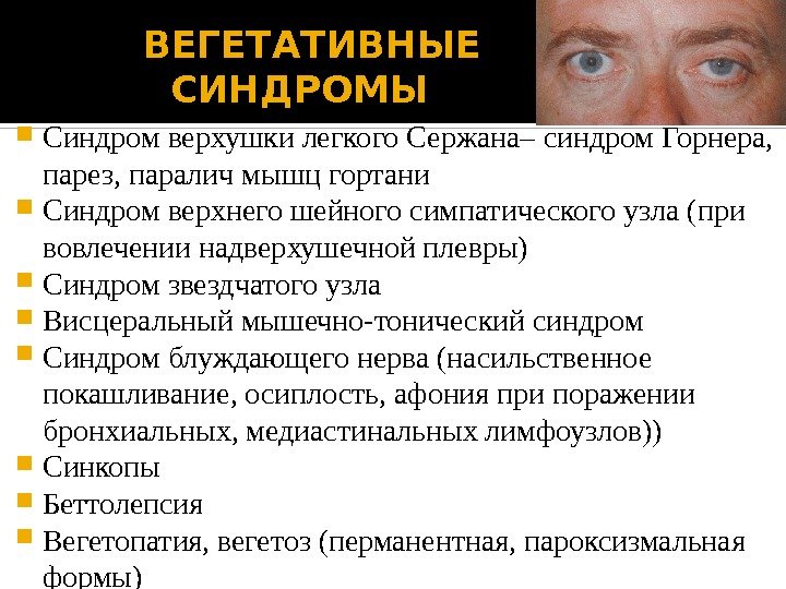 ВЕГЕТАТИВНЫЕ СИНДРОМЫ Синдром верхушки легкого Сержана– синдром Горнера, парез, паралич мышц гортани Синдром верхнего шейного симпатического узла (при вовлечении надверхушечной плевры) Синдром звездчатого узла Висцеральный мышечно-тонический синдром Синдром блуждающего нерва (насильственное покашливание, осиплость, афония при поражении бронхиальных, медиастинальных лимфоузлов)) Синкопы Беттолепсия Вегетопатия, вегетоз (перманентная, пароксизмальная формы)