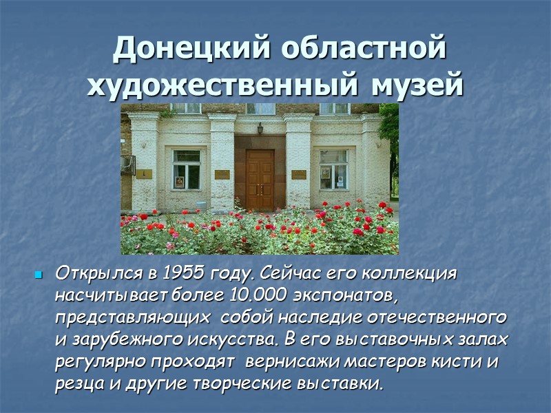 Донецкий областной художественный музей Открылся в 1955 году. Сейчас его коллекция насчитывает более 10.000 экспонатов, представляющих собой наследие отечественного и зарубежного искусства. В его выставочных залах регулярно проходят вернисажи мастеров кисти и резца и другие творческие выставки.