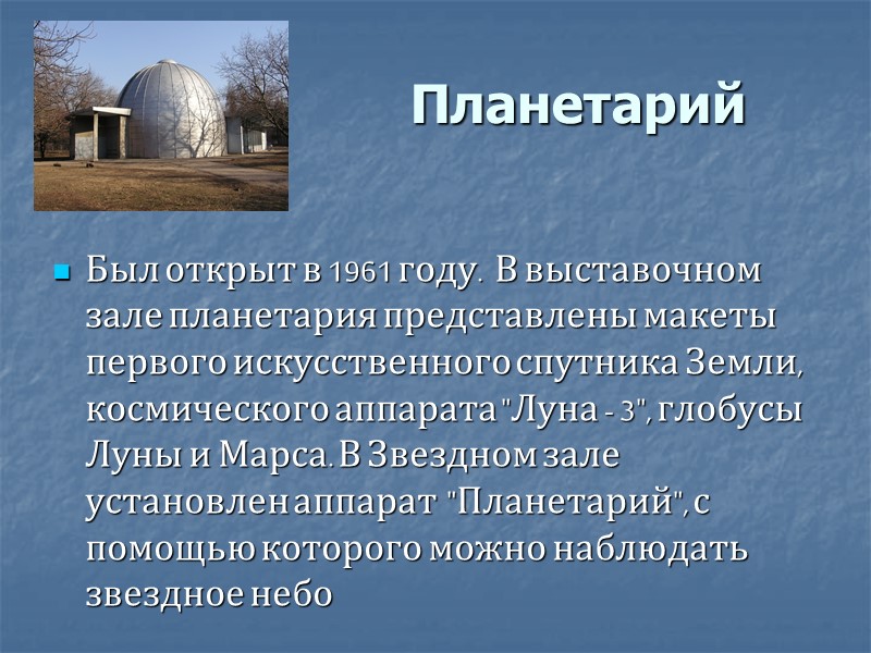 Планетарий Был открыт в 1961 году. В выставочном зале планетария представлены макеты первого искусственного спутника Земли, космического аппарата "Луна - 3", глобусы Луны и Марса. В Звездном зале установлен аппарат "Планетарий", с помощью которого можно наблюдать звездное небо