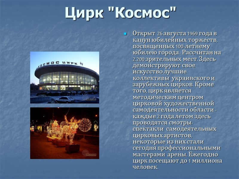 Цирк "Космос" Открыт 26 августа 1969 года в канун юбилейных торжеств, посвященных 100-летнему юбилею города. Рассчитан на 2.200 зрительных мест. Здесь демонстрируют свое искусство лучшие коллективы украинского и зарубежных цирков. Кроме того, цирк является методическим центром цирковой художественной самодеятельности области - каждые 2 года летом здесь проводятся смотры-спектакли самодеятельных цирковых артистов, некоторые из них стали сегодня профессиональными мастерами арены. Ежегодно цирк посещают до 1 миллиона человек.