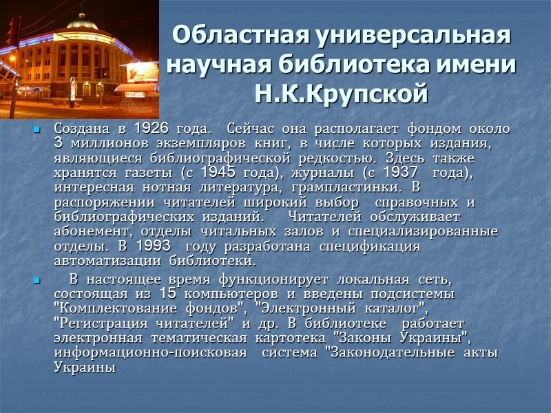 Областная универсальная научная библиотека имени Н.К.Крупской Создана в 1926 года. Сейчас она располагает фондом около 3 миллионов экземпляров книг, в числе которых издания, являющиеся библиографической редкостью. Здесь также хранятся газеты (с 1945 года), журналы (с 1937 года), интересная нотная литература, грампластинки. В распоряжении читателей широкий выбор справочных и библиографических изданий. Читателей обслуживает абонемент, отделы читальных залов и специализированные отделы. В 1993 году разработана спецификация автоматизации библиотеки. В настоящее время функционирует локальная сеть, состоящая из 15 компьютеров и введены подсистемы "Комплектование фондов", "Электронный каталог", "Регистрация читателей" и др. В библиотеке работает электронная тематическая картотека "Законы Украины", информационно-поисковая система "Законодательные акты Украины