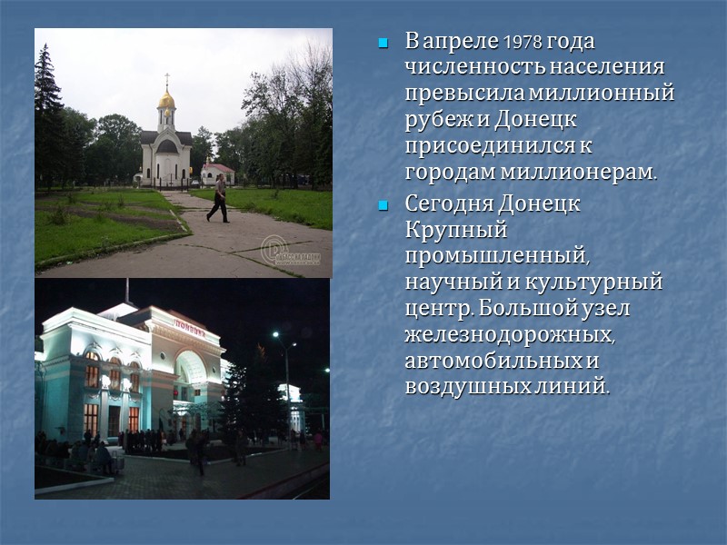 В апреле 1978 года численность населения превысила миллионный рубеж и Донецк присоединился к городам миллионерам. Сегодня Донецк Крупный промышленный, научный и культурный центр. Большой узел железнодорожных, автомобильных и воздушных линий.