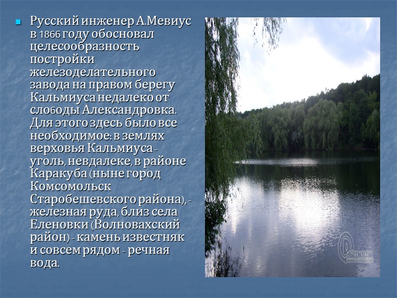 Русский инженер А.Мевиус в 1866 году обосновал целесообразность постройки железоделательного завода на правом берегу Кальмиуса недалеко от сло6оды Александровка. Для этого здесь было все необходимое: в землях верховья Кальмиуса - уголь, невдалеке, в районе Каракуба (ныне город Комсомольск Старобешевского района), - железная руда, близ села Еленовки (Волновахский район) - камень известняк и совсем рядом - речная вода.