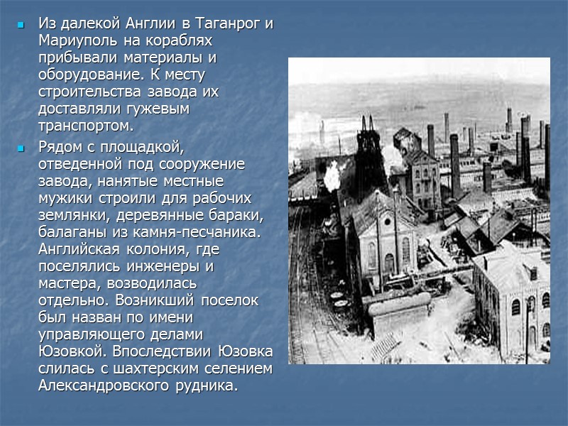 Из далекой Англии в Таганрог и Мариуполь на кораблях прибывали материалы и оборудование. К месту строительства завода их доставляли гужевым транспортом. Рядом с площадкой, отведенной под сооружение завода, нанятые местные мужики строили для рабочих землянки, деревянные бараки, балаганы из камня-песчаника. Английская колония, где поселялись инженеры и мастера, возводилась отдельно. Возникший поселок был назван по имени управляющего делами Юзовкой. Впоследствии Юзовка слилась с шахтерским селением Александровского рудника.