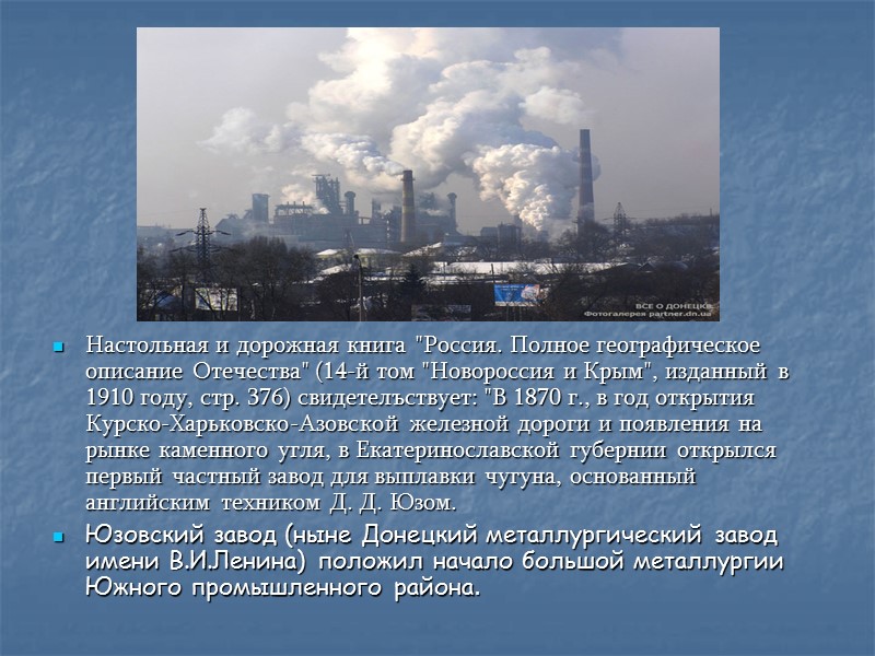 Настольная и дорожная книга "Россия. Полное географическое описание Отечества" (14-й том "Новороссия и Крым", изданный в 1910 году, стр. 376) свидетелъcтвует: "В 1870 г., в год открытия Курско-Харьковско-Азовской железной дороги и появления на рынке каменного угля, в Екатеринославской губернии открылся первый частный завод для выплавки чугуна, основанный английским техником Д. Д. Юзом. Юзовский завод (ныне Донецкий металлургический завод имени В.И.Ленина) положил начало большой металлургии Южного промышленного района.