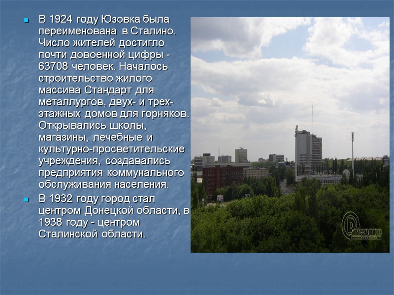 В 1924 году Юзовка была переименована в Сталино. Число жителей достигло почти довоенной цифры - 63708 человек. Началось строительство жилого массива Стандарт для металлургов, двух- и трех- этажных домов для горняков. Открывались школы, магазины, лечебные и культурно-просветительские учреждения, создавались предприятия коммунального обслуживания населения. В 1932 году город стал центром Донецкой области, в 1938 году - центром Сталинской области.