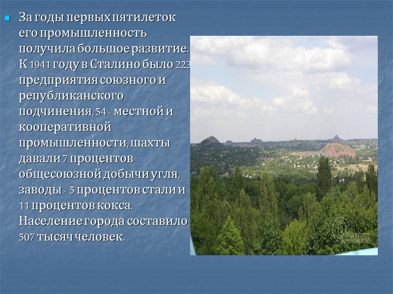 За годы первых пятилеток его промышленность получила большое развитие. К 1941 году в Сталино было 223 предприятия союзного и републиканского подчинения, 54 - местной и кооперативной промышленности, шахты давали 7 процентов общесоюзной добычи угля, заводы - 5 процентов стали и 11 процентов кокса. Население города составило 507 тысяч человек.
