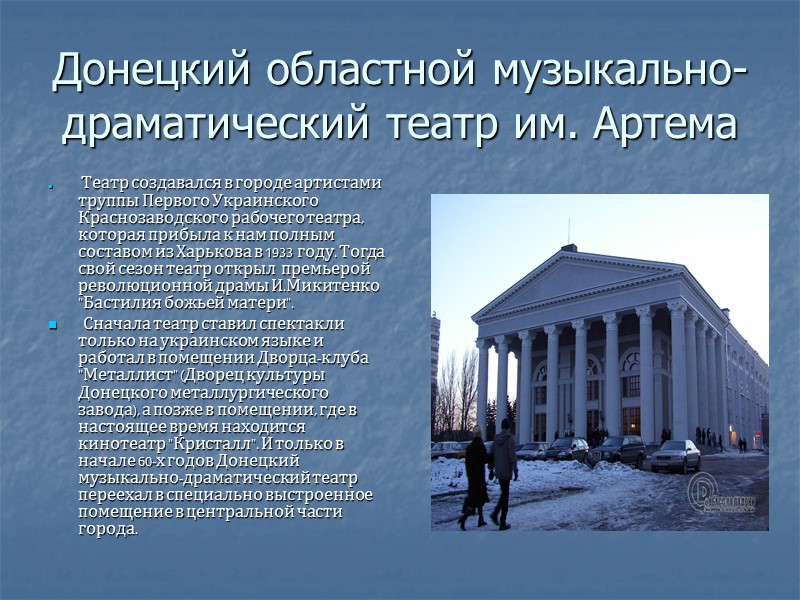 Донецкий областной музыкально-драматический театр им. Артема Театр создавался в городе артистами труппы Первого Украинского Краснозаводского рабочего театра, которая прибыла к нам полным составом из Харькова в 1933 году. Тогда свой сезон театр открыл премьерой революционной драмы И.Микитенко "Бастилия божьей матери". Сначала театр ставил спектакли только на украинском языке и работал в помещении Дворца-клуба "Металлист" (Дворец культуры Донецкого металлургического завода), а позже в помещении, где в настоящее время находится кинотеатр "Кристалл". И только в начале 60-х годов Донецкий музыкально-драматический театр переехал в специально выстроенное помещение в центральной части города.