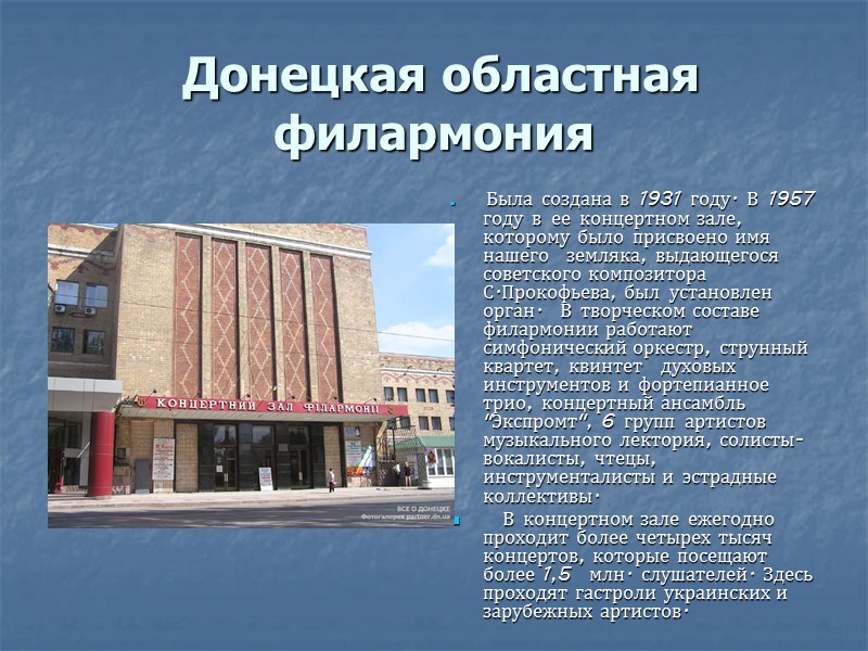 Донецкая областная филармония Была создана в 1931 году. В 1957 году в ее концертном зале, которому было присвоено имя нашего земляка, выдающегося советского композитора С.Прокофьева, был установлен орган. В творческом составе филармонии работают симфонический оркестр, струнный квартет, квинтет духовых инструментов и фортепианное трио, концертный ансамбль "Экспромт", 6 групп артистов музыкального лектория, солисты-вокалисты, чтецы, инструменталисты и эстрадные коллективы. В концертном зале ежегодно проходит более четырех тысяч концертов, которые посещают более 1,5 млн. слушателей. Здесь проходят гастроли украинских и зарубежных артистов.