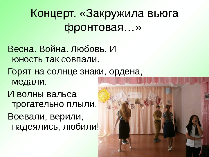Концерт. «Закружила вьюга фронтовая…» Весна. Война. Любовь. И юность так совпали. Горят на солнце знаки, ордена, медали. И волны вальса трогательно плыли. Воевали, верили, надеялись, любили!