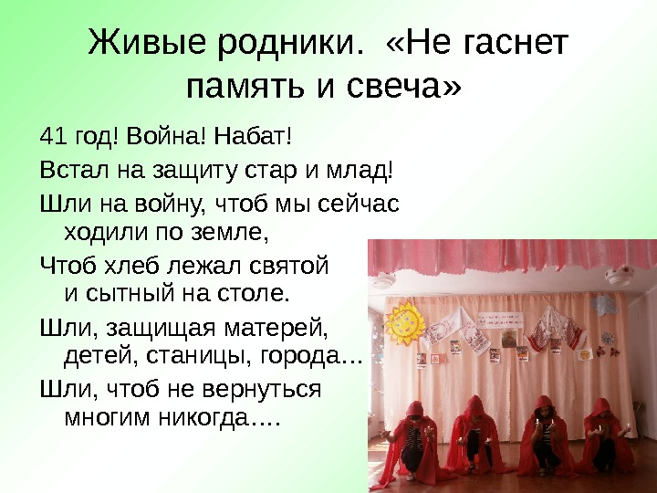 Живые родники. «Не гаснет память и свеча» 41 год! Война! Набат! Встал на защиту стар и млад! Шли на войну, чтоб мы сейчас ходили по земле, Чтоб хлеб лежал святой и сытный на столе. Шли, защищая матерей, детей, станицы, города… Шли, чтоб не вернуться многим никогда….