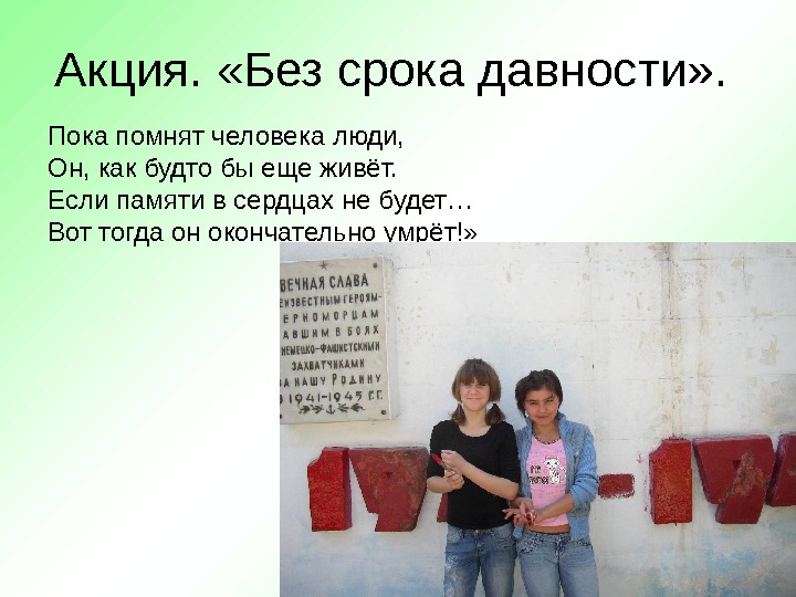 Акция. «Без срока давности» . Пока помнят человека люди, Он, как будто бы еще живёт. Если памяти в сердцах не будет… Вот тогда он окончательно умрёт!»