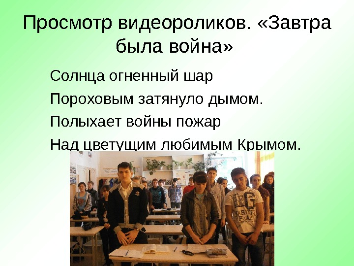 Просмотр видеороликов. «Завтра была война» Солнца огненный шар Пороховым затянуло дымом. Полыхает войны пожар Над цветущим любимым Крымом.