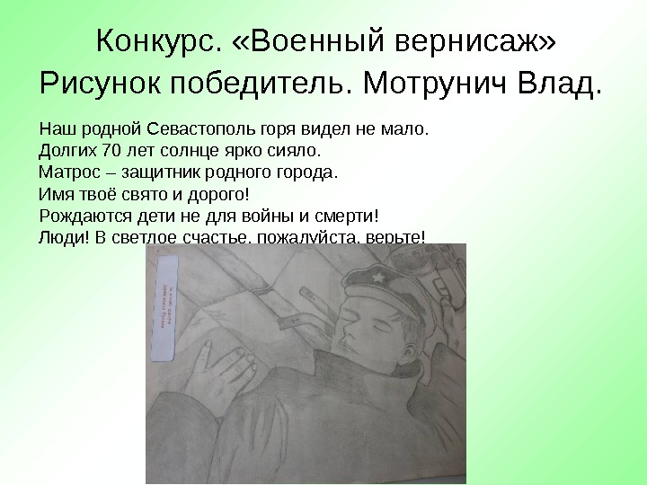 Конкурс. «Военный вернисаж» Рисунок победитель. Мотрунич Влад. Наш родной Севастополь горя видел не мало. Долгих 70 лет солнце ярко сияло. Матрос – защитник родного города. Имя твоё свято и дорого! Рождаются дети не для войны и смерти! Люди! В светлое счастье, пожалуйста, верьте!