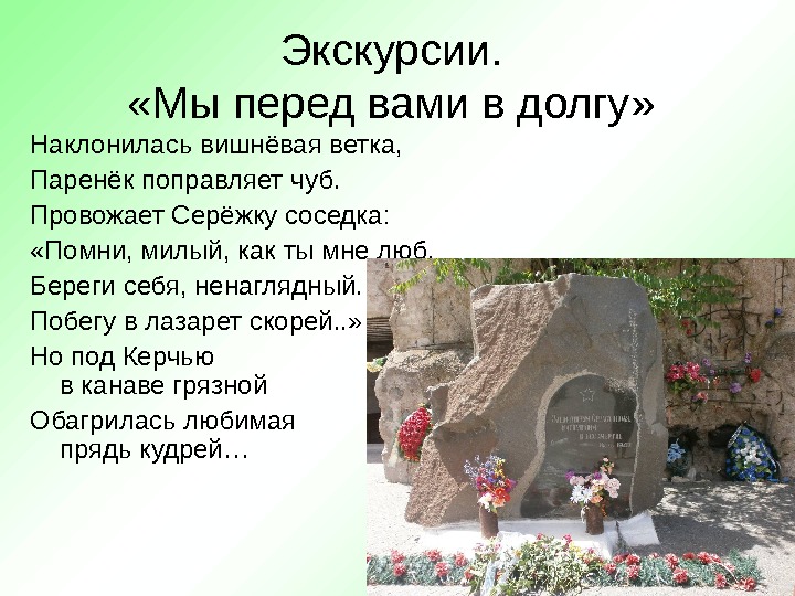 Экскурсии. «Мы перед вами в долгу» Наклонилась вишнёвая ветка, Паренёк поправляет чуб. Провожает Серёжку соседка: «Помни, милый, как ты мне люб, Береги себя, ненаглядный. Побегу в лазарет скорей. . » Но под Керчью в канаве грязной Обагрилась любимая прядь кудрей…