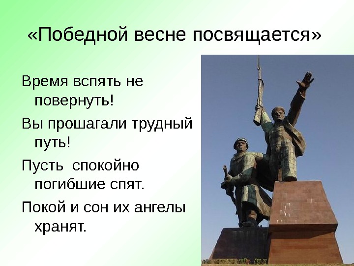 «Победной весне посвящается» Время вспять не повернуть! Вы прошагали трудный путь! Пусть спокойно погибшие спят. Покой и сон их ангелы хранят.