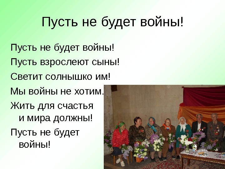 Пусть не будет войны! Пусть взрослеют сыны! Светит солнышко им! Мы войны не хотим. Жить для счастья и мира должны! Пусть не будет войны!