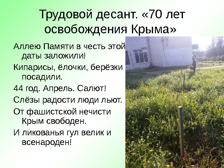 Трудовой десант. « 70 лет освобождения Крыма» Аллею Памяти в честь этой даты заложили! Кипарисы, ёлочки, берёзки посадили. 44 год. Апрель. Салют! Слёзы радости люди льют. От фашистской нечисти Крым свободен. И ликованья гул велик и всенароден!