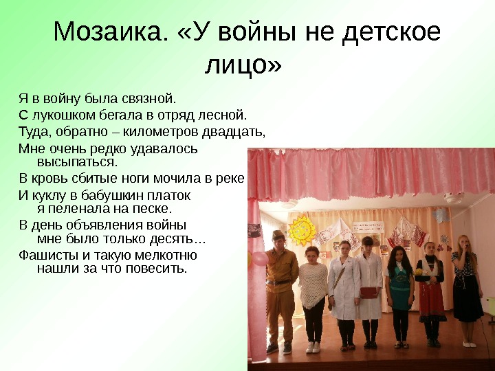 Мозаика. «У войны не детское лицо» Я в войну была связной. С лукошком бегала в отряд лесной. Туда, обратно – километров двадцать, Мне очень редко удавалось высыпаться. В кровь сбитые ноги мочила в реке И куклу в бабушкин платок я пеленала на песке. В день объявления войны мне было только десять… Фашисты и такую мелкотню нашли за что повесить.
