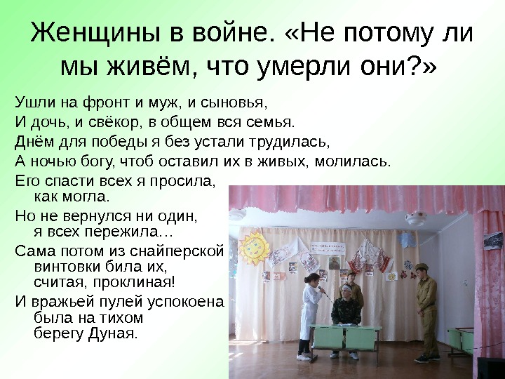 Женщины в войне. «Не потому ли мы живём, что умерли они? » Ушли на фронт и муж, и сыновья, И дочь, и свёкор, в общем вся семья. Днём для победы я без устали трудилась, А ночью богу, чтоб оставил их в живых, молилась. Его спасти всех я просила, как могла. Но не вернулся ни один, я всех пережила… Сама потом из снайперской винтовки била их, считая, проклиная! И вражьей пулей успокоена была на тихом берегу Дуная.