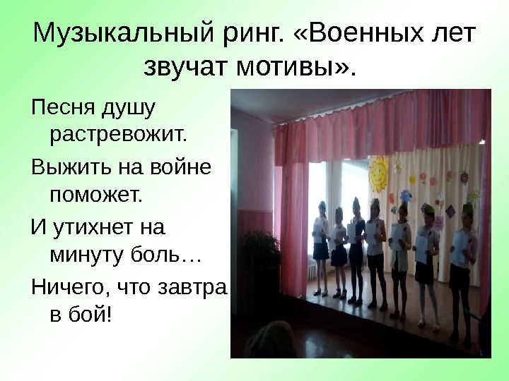 Музыкальный ринг. «Военных лет звучат мотивы» . Песня душу растревожит. Выжить на войне поможет. И утихнет на минуту боль… Ничего, что завтра в бой!