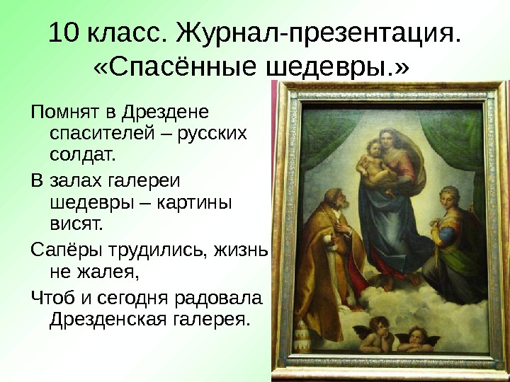 10 класс. Журнал-презентация. «Спасённые шедевры. » Помнят в Дрездене спасителей – русских солдат. В залах галереи шедевры – картины висят. Сапёры трудились, жизнь не жалея, Чтоб и сегодня радовала Дрезденская галерея.