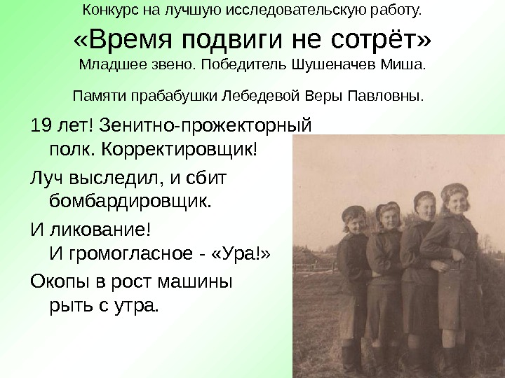 Конкурс на лучшую исследовательскую работу. «Время подвиги не сотрёт» Младшее звено. Победитель Шушеначев Миша. Памяти прабабушки Лебедевой Веры Павловны. 19 лет! Зенитно-прожекторный полк. Корректировщик! Луч выследил, и сбит бомбардировщик. И ликование! И громогласное — «Ура!» Окопы в рост машины рыть с утра.