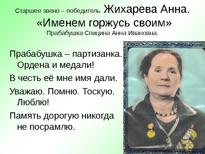Старшее звено – победитель Жихарева Анна. «Именем горжусь своим» Прабабушка Спицина Анна Ивановна. Прабабушка – партизанка. Ордена и медали! В честь её мне имя дали. Уважаю. Помню. Тоскую. Люблю! Память дорогую никогда не посрамлю.