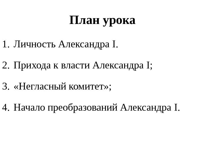 План урока 1. Личность Александра I. 2. Прихода к власти Александра I ; 3. «Негласный комитет» ; 4. Начало преобразований Александра I.