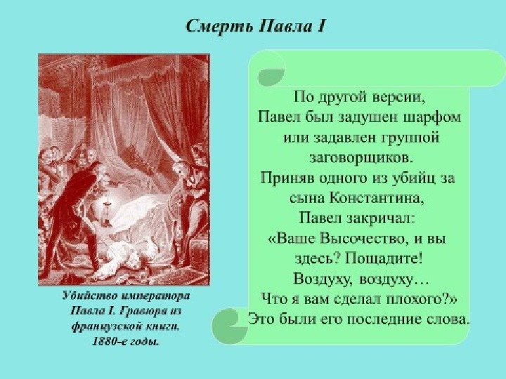 Павел I (1796 -1801) Павел I передал Александру I своё пристрастие к военному делу. Научил сына совмещать душевную любовь к человечеству с практической заботой о ближнем. С детства он разрывался между отцом и бабкой и поэтому в нем сформировались такие черты как лицемерие и двуличность. Боровиковский В. Л. Портрет Павла I. около 1800 г