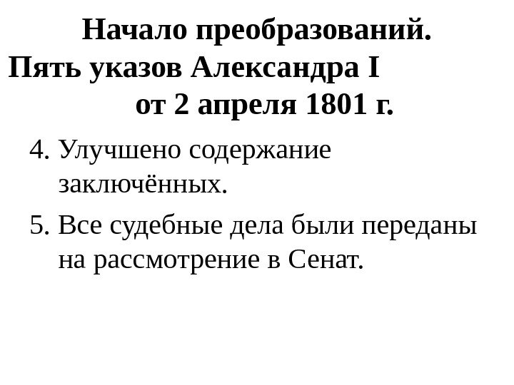 Начало преобразований. Пять указов Александра I от 2 апреля 1801 г. 4. Улучшено содержание заключённых. 5. Все судебные дела были переданы на рассмотрение в Сенат.