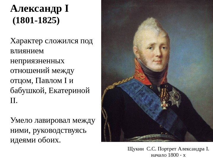 Александр I (1801 -1825) Характер сложился под влиянием неприязненных отношений между отцом, Павлом I и бабушкой, Екатериной II. Умело лавировал между ними, руководствуясь идеями обоих. Щукин С. С. Портрет Александра I. начало 1800 — х