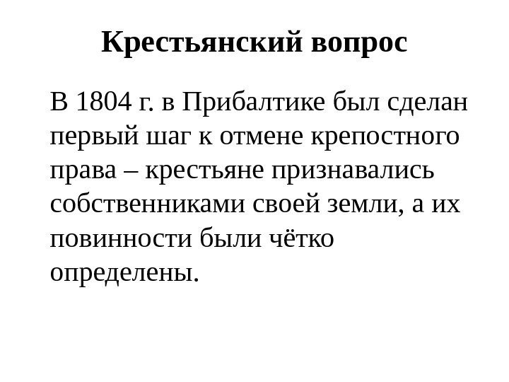 Крестьянский вопрос В 1804 г. в Прибалтике был сделан первый шаг к отмене крепостного права – крестьяне признавались собственниками своей земли, а их повинности были чётко определены.