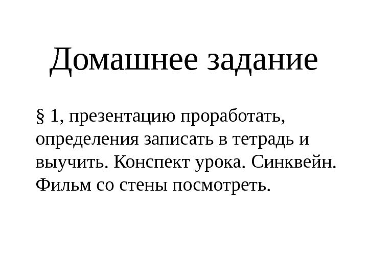 Домашнее задание § 1, презентацию проработать, определения записать в тетрадь и выучить. Конспект урока. Синквейн. Фильм со стены посмотреть.