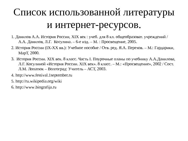 Список использованной литературы и интернет-ресурсов. 1. Данилов А. А. История России, XIX век : учеб. для 8 кл. общеобразоват. учреждений / А. А. Данилов, Л. Г. Косулина. – 6 -е изд. – М. : Просвещение, 2005. 2. История России ( IX — XX вв. ): Учебное пособие / Отв. ред. Я. А. Перехов. – М. : Гардарики, Мар. Т, 2000. 3. История России. XIX век. 8 класс. Часть I. Поурочные планы по учебнику А. А. Данилова, Л. Г. Косулиной «История России. XIX век» . 8 класс. – М. : «Просвещение» , 2002 / Сост. Л. М. Лопатюк – Волгоград: Учитель – АСТ, 2003. 4. http: //www. festival. 1 september. ru 5. http: //ru. wikipedia. org/wiki 6. http : // www. biografija. ru